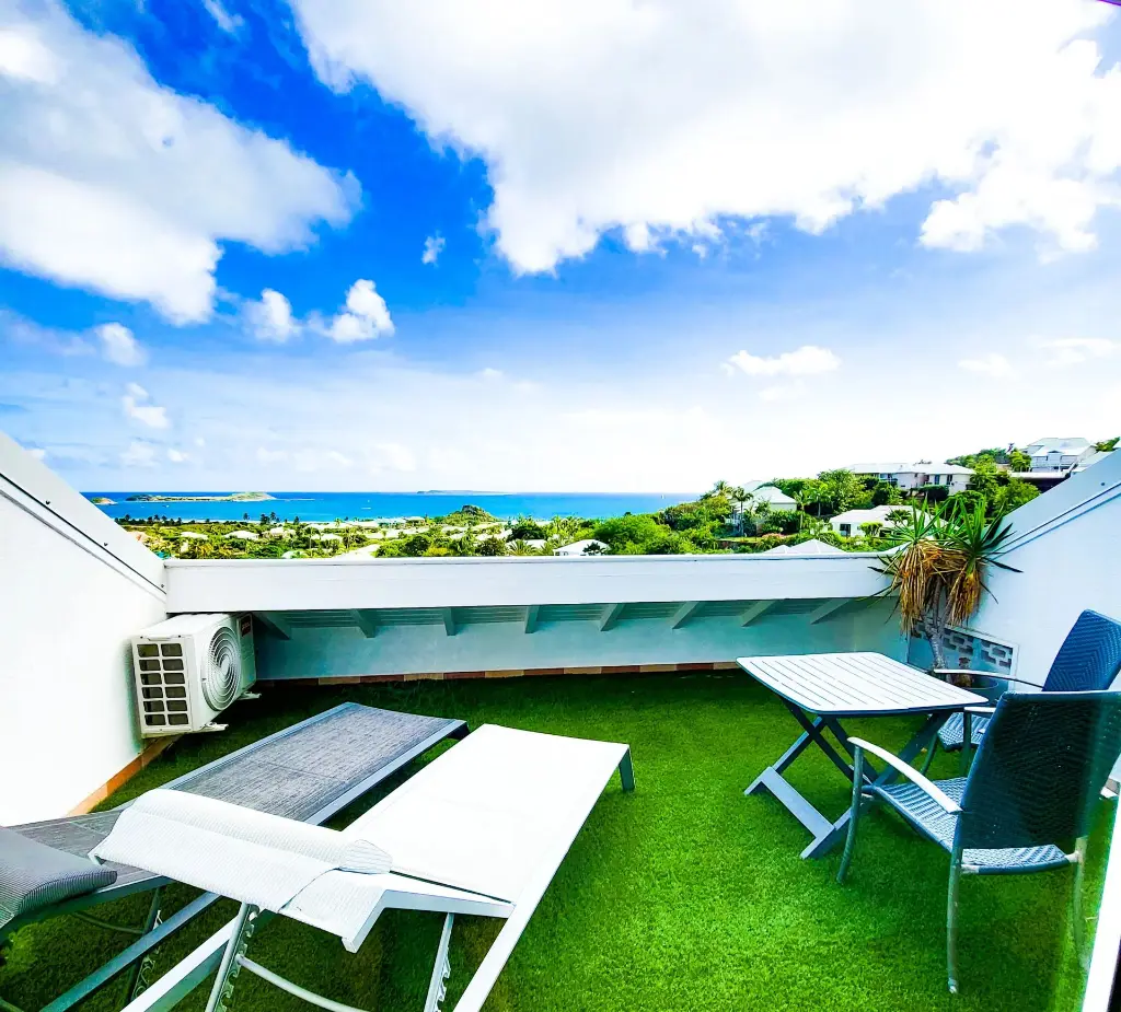 King View: chambre à l’étage pleine vue mer avec terrasse privative, transat, table et chaises.